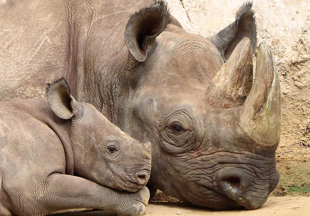 El otro rinoceronte que vive en África es el rinoceronte negro (Dioceros bicornis), catalogado “en peligro de extinción” ya que quedan en libertad tan solo 5.000 ejemplares. Viven en Namibia, Sudáfrica y Kenya, y son más pequeños que sus familiares, ya que como mucho llegan a pesar 1.5 toneladas.